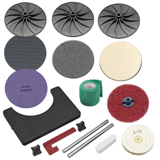 This is the full list of items available in the JOOLTOOL online store. Browse for your favorite kits, add-on accessories and abrasives. It's the go-to for all your jewelry finishing, metalworking, woodworking, automotive projects and more!