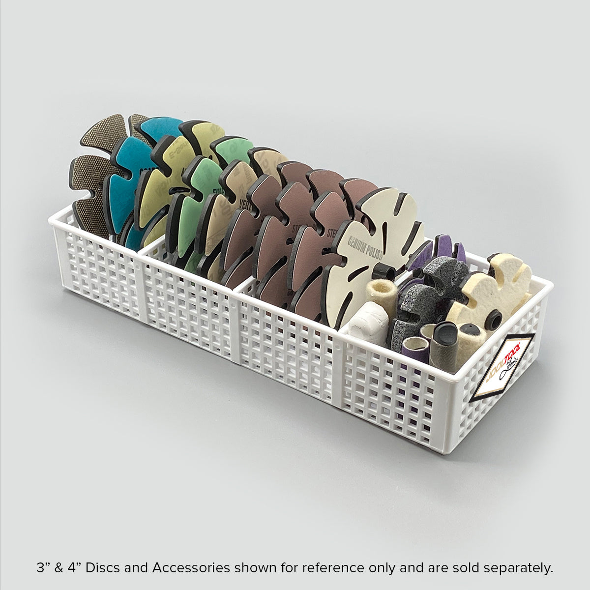 Depending on the version, they can hold anything from 3 INCH discs, 4 INCH discs, Radial Bristle Brushes, Buffing Wheels, Flexshaft, Accessories or even the JOOLTOOL machine itself and more!